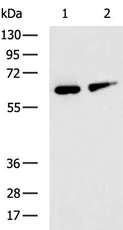 Gel: 8%SDS-PAGE, Lysate: 40 μg, Lane 1-2: 293T and HUVEC cell lysates, Primary antibody: P07329(GRK4 Antibody) at dilution 1/600, Secondary antibody: Goat anti rabbit IgG at 1/5000 dilution, Exposure time: 15 seconds |