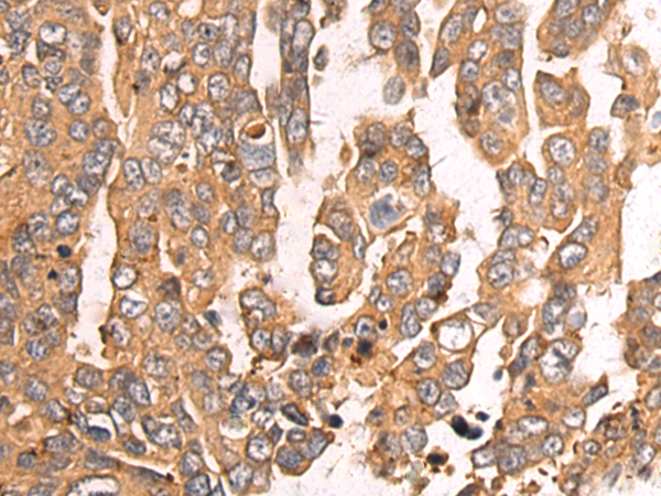 The image is immunohistochemistry of paraffin-embedded Human colorectal cancer tissue using P07329(GRK4 Antibody) at dilution 1/60. (Original magnification: ×200) |