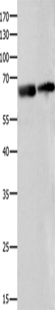 Gel: 8%SDS-PAGE, Lysate: 40 μg, Lane 1-2: Human liver tissue, Human ovarian cancer tissue, Primary antibody: P07368(IGF2BP2 Antibody) at dilution 1/300, Secondary antibody: Goat anti rabbit IgG at 1/8000 dilution, Exposure time: 2 minutes |
