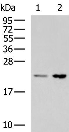 Gel: 12%SDS-PAGE, Lysate: 40 μg, Lane 1-2: Hela and HepG2 cell lysates, Primary antibody: P07377(IL18 Antibody) at dilution 1/800, Secondary antibody: Goat anti rabbit IgG at 1/5000 dilution, Exposure time: 20 seconds |