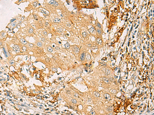 The image is immunohistochemistry of paraffin-embedded Human breast cancer tissue using P07377(IL18 Antibody) at dilution 1/40. (Original magnification: ×200) |