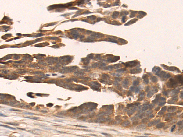 The image is immunohistochemistry of paraffin-embedded Human colorectal cancer tissue using P07384(INHBA Antibody) at dilution 1/50. (Original magnification: ×200) |