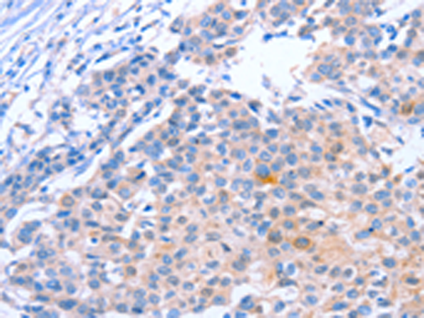 The image is immunohistochemistry of paraffin-embedded Human breast cancer tissue using P07406(KLF15 Antibody) at dilution 1/30. (Original magnification: ×200) |