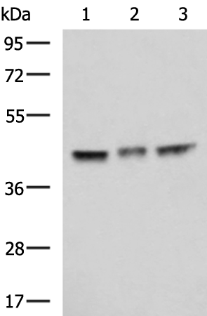 Gel: 8%SDS-PAGE, Lysate: 40 μg, Lane 1-3: A172, K562, Jurkat cell lysates, Primary antibody: P07402(MAPK8 Antibody) at dilution 1/800, Secondary antibody: Goat anti rabbit IgG at 1/5000 dilution, Exposure time: 5 seconds |