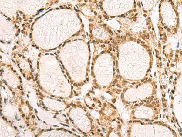 The image is immunohistochemistry of paraffin-embedded Human thyroid cancer tissue using P07402(MAPK8 Antibody) at dilution 1/95. (Original magnification: ×200) |